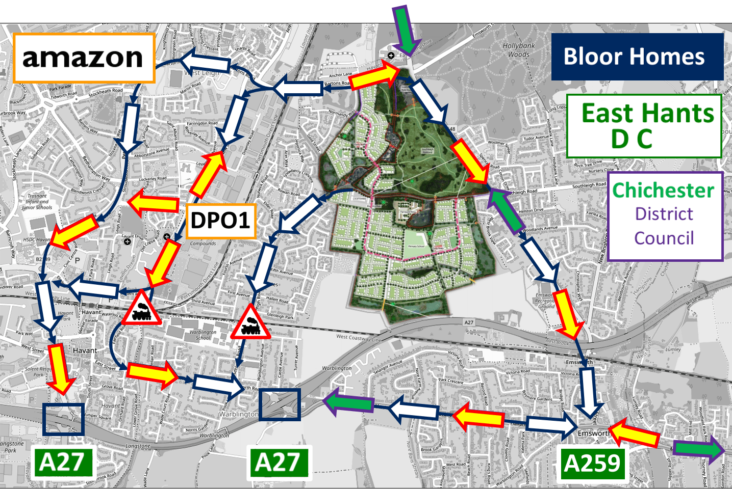 The packed audience at the Havant Public Plaza for the Southleigh Development Consultation Forum on 27 January heard that Chichester District Council has up to 11,000 houses in plan for the A259 corridor between Emsworth and Fishbourne. With Portsmouth’s massive but landlocked Amazon DPO1 delivery station in New Lane Havant eager to push its new same‑day delivery operation through the Warblington A27 junction and along the A259 through Emsworth to reach these new homes, the result is a guaranteed recipe for gridlock and chaos.
