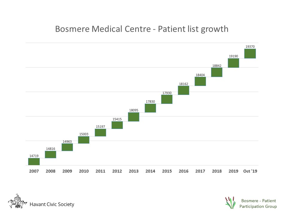 The chart above demonstrates how the Bosmere Medical Practice patient list has grown steadily year on year, from 14,700 in 2007, to the current total of 19,370. Given the catchment area of the practice and the growth in population planned in the Havant Borough Local Plan 2036, we can safely predict that this rate of growth will continue.