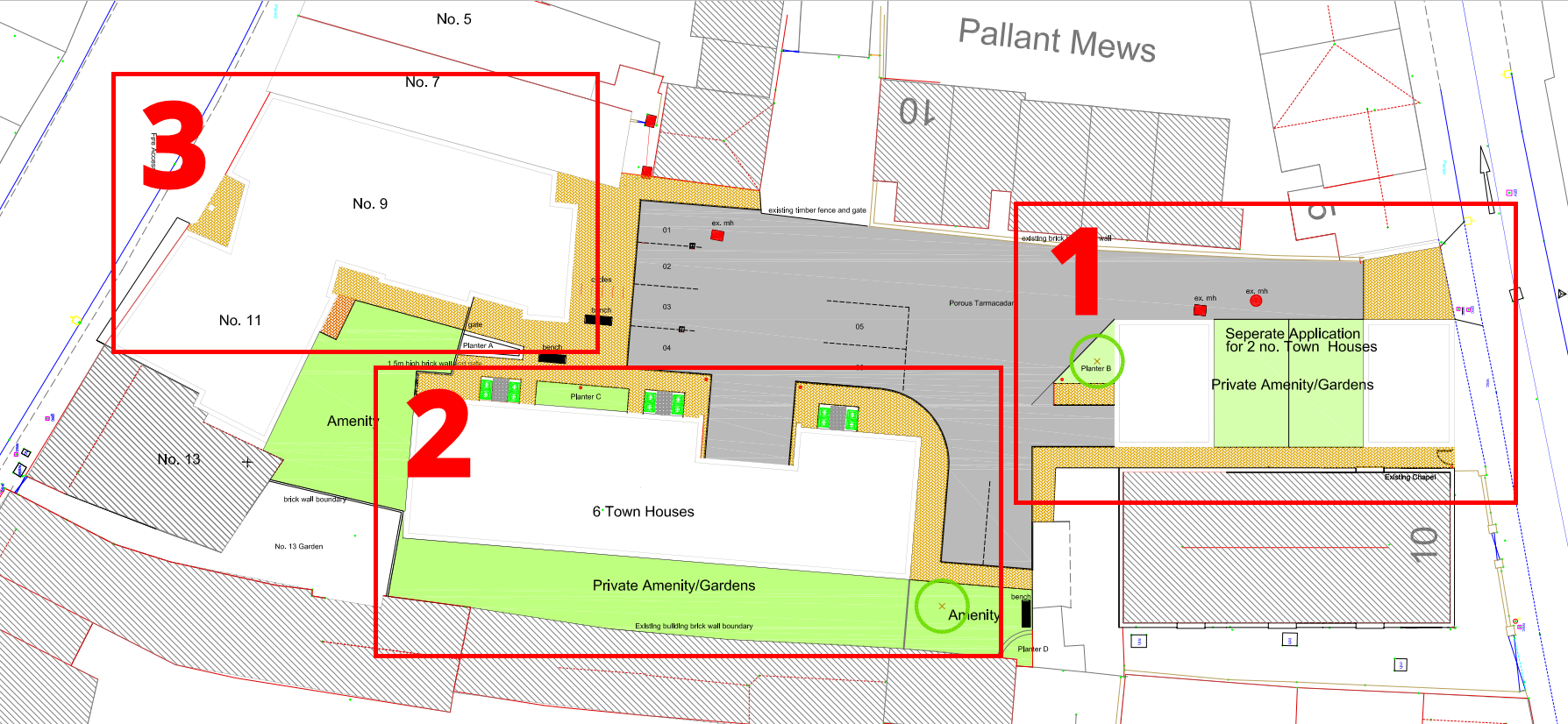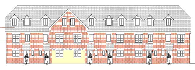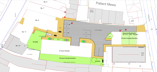 The second application is for a row of 6 town houses, with three bedrooms each and sharing just four car parking spaces. These houses will be accessed via the arch at The Pallant from the previous application.