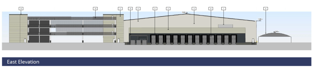 A quick glance at the pre-planning sales pitch gives an indication of the scale of the proposed operation – think DHL or FedEx, and you’d probably be on the right track. There would be provision for the storage of around 450 large ‘transit’ sized delivery vans on three levels (’18’ on plan below), with additional van parking to the north and east providing for another 200 vans. Twelve unloading bays on the eastern side will receive a significant number of incoming HGVs from other national distribution centres. At the front of the site, car parking for 200 cars, plus motorcycle and bicycle parking will serve the staff.