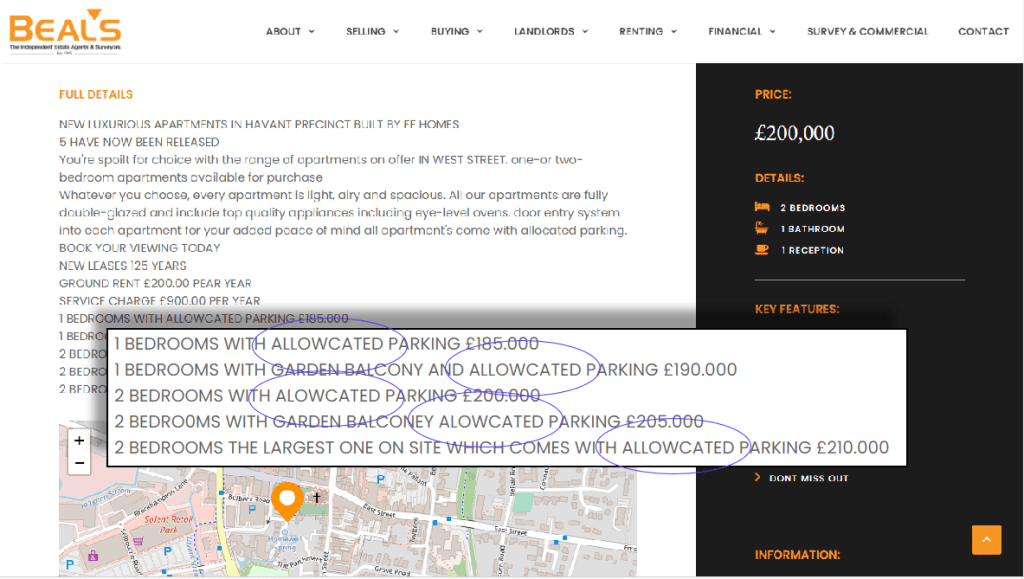 If you’re interested in buying the 125 year lease on one of the apartments, just click the image below. As well as a Juliette balcony overlooking McDonalds, you get the exclusive use of alowcated parking. Or is that allowcated parking? Not forgetting the ‘garden balconey’, or should that read ‘baloney’?