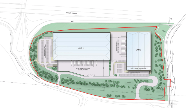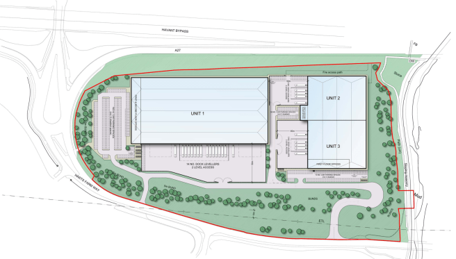 The application offers three indicative site layouts as illustrations. These show either one, two or three large three storey sheds, with HGV and car parking, which is in line with the objective for the site set out in the Opportunity Havant Regeneration Strategy. Located with direct access to the major A27/A3(M) junction, this is an application to build a site for letting to distribution / warehousing / ‘last mile’ delivery operations.