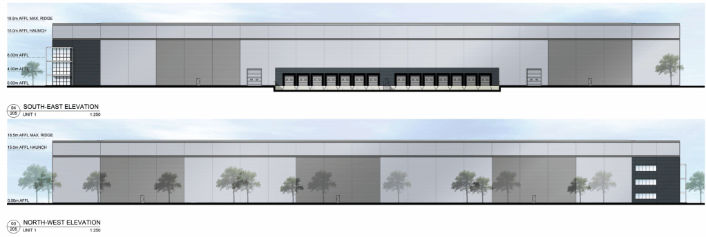 The proposed style of the structure would be difficult to reimagine, but the following elevations, which relate to the single large ‘Unit 1’ option above, give an idea of the kind of structure that we might expect in a later planning application.