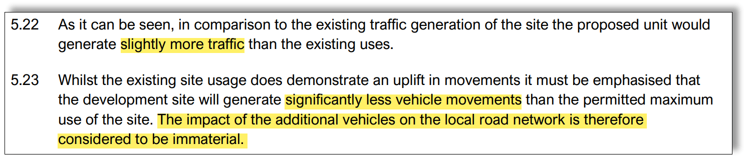 Table 5.4 is used to demonstrate that, compared “to the previous maximum usage of the site the proposed development would generate less traffic both during peak hours and across the day”. That’s very convenient but also rather misleading since the ‘Previous Maximum’ numbers are theoretical, assuming the traffic that might be generated if the site were used to the maximum extent allowed under the planning permissions currently in place. This theoretical decrease of just 90 daily vehicle movements is referred to in the document as “significantly less vehicle movements”.
