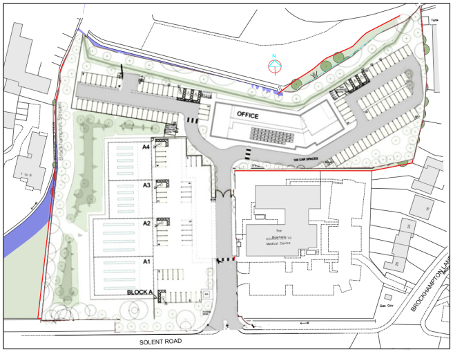 The next two slides show the plans for the immediate surroundings of the Bosmere Medical Centre in Solent Road. The current aerial view shows the dedicated access road into the surgery and the pharmacy with staff parking to the right of the buildings and patient parking in front. Those who know the surgery will know that the short cul de sac to the left is often also jammed with waiting cars at peak surgery hours. Surgery hours are dictated by the NHS contract and thus coincide with peak morning and afternoon Solent Road traffic.