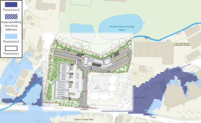 “The current EA Flood Map shows that a large part of the site is located in land designated as Flood Zone 3 (high probability of fluvial flooding) and is shown as undefended. The north eastern corner is shown to be in Flood Zone 1 (low probability of flooding). The site is greater than 1 ha.