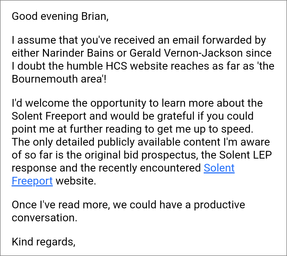 Earlier this month I wrote to Cllr. Narinder Bains and Cllr. Gerald Vernon-Jackson, Solent Freeport Board members representing Havant and Portsmouth respectively, with a fairly straightforward question: