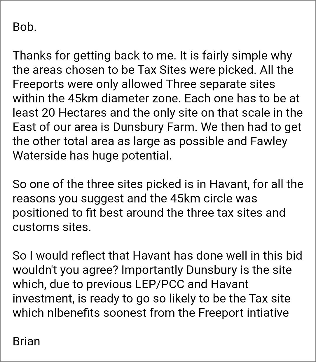 “… from the information in the public domain, it seems that Havant’s only Freeport interest is at Dunsbury Park, presumably for secure warehousing. Can you confirm whether or not the New Lane manufacturing and warehousing opportunity was reviewed during the bid process?”