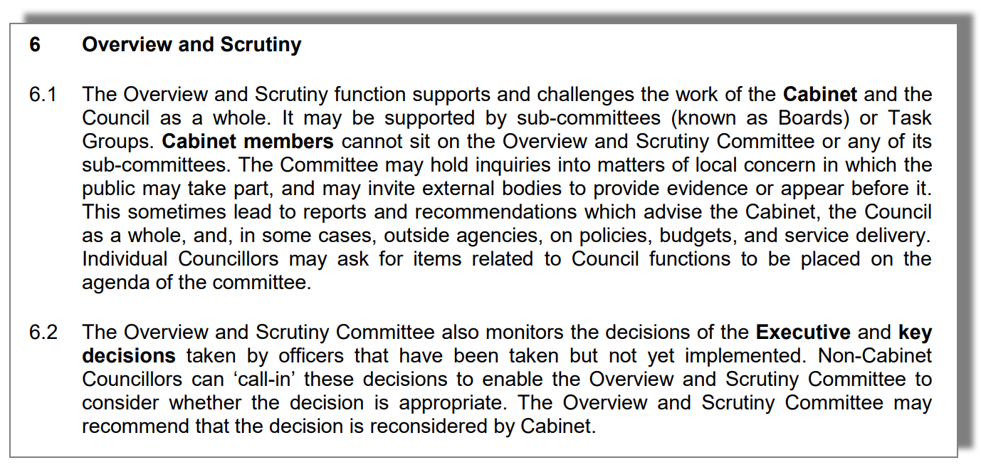 This time last week we’d been watching the Overview and Scrutiny Committee review three papers due to be presented to the HBC Cabinet on September 8th. Knowing how important these three papers are, we took a look at the HBC Constitution to remind ourselves of just how the Overview and Scrutiny process should work.