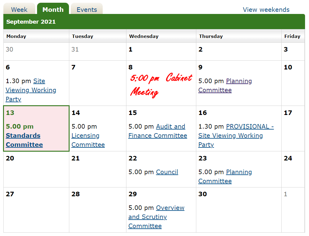 Several people have been in touch today to say that they couldn’t find the papers from last week’s Cabinet Meeting. In fact, the Cabinet meeting of Wednesday 8 September had completely disappeared from the HBC Meetings Calendar.