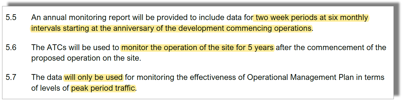 This current application therefore seeks to reduce the monitoring under Condition 10 to just 2 hours a day, (defined as ‘peak period’), over a five day week, on two occasions in any year. That’s a total of just twenty hours’ monitoring in a year, managed by the occupier and supplied in arrears once a year as a single report. The Operational Management Plan goes further, saying that the first traffic report will be issued on the anniversary of the start of operations – a year after the proverbial horse has bolted!