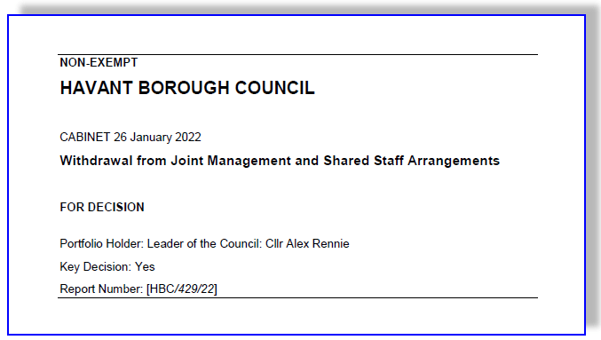 At this afternoon’s brief Extraordinary Council Meeting, Cllr. Satchwell likened the split with East Hants District Council (EHDC) to “a de-coupling, a divorce, or ‘other things'”, but suffice to say, in less than ten minutes, we witnessed an extraordinary degree of upbeat boosterism from the Leader as the Cabinet listened attentively, debated in ‘the usual manner’, then unanimously approved the recommendations in his paper on the ‘Withdrawal from Joint Management and Shared Staff Arrangements’.