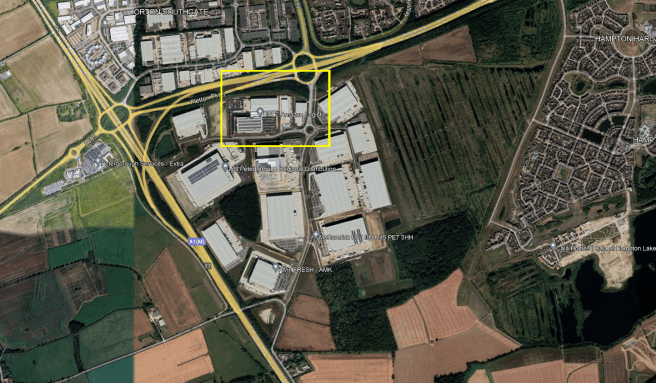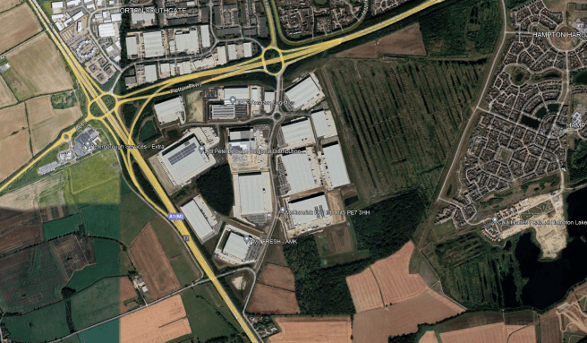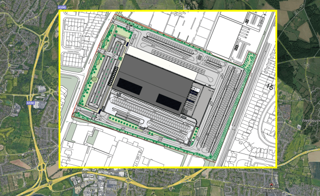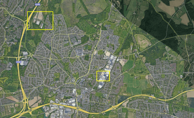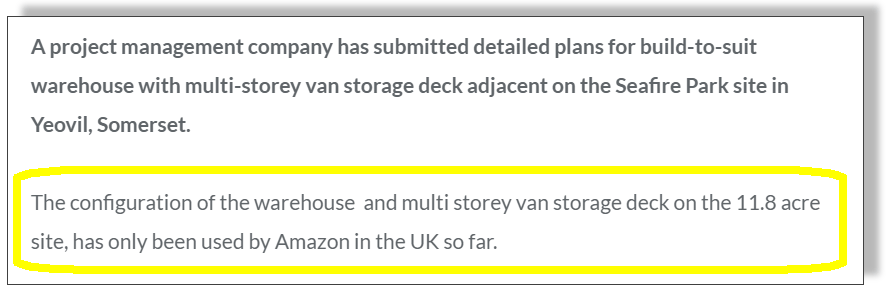 You really couldn’t make this story up. In the images below, the first shows the two alternative sites being considered by Amazon, with Dunsbury Park right next to the A3(M), the 32 New Lane site apparently ‘chosen’, and a drawing of the warehouse and its ‘distinctive van storage decks’. Compare with the images later in this post.