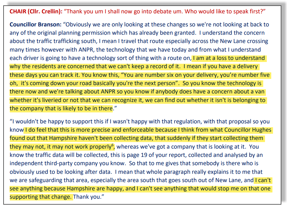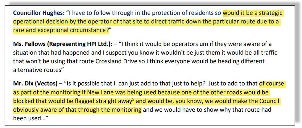 In this next extract, Cllr. Hughes questions the Applicant over the ‘rare and exceptional’ instances in which site traffic would take the route south down New Lane: