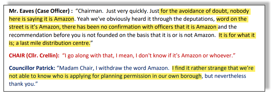 “For the avoidance of doubt, nobody here is saying it is Amazon… the recommendation before you is not founded on the basis that it is or is not Amazon. It is for what it is, a last mile distribution centre.”