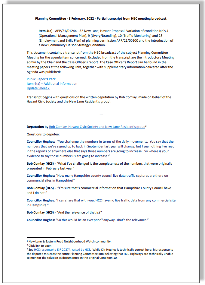 The New Lane residents and Havant Civic Society will certainly participate in the Community Liaison Panel, however we’re only too aware that the horse has now already bolted, along with the data. The Planning Committee decision means that the site traffic data has now been given to the ‘independent third party’, the one already selected, recommended and appointed by the applicant.