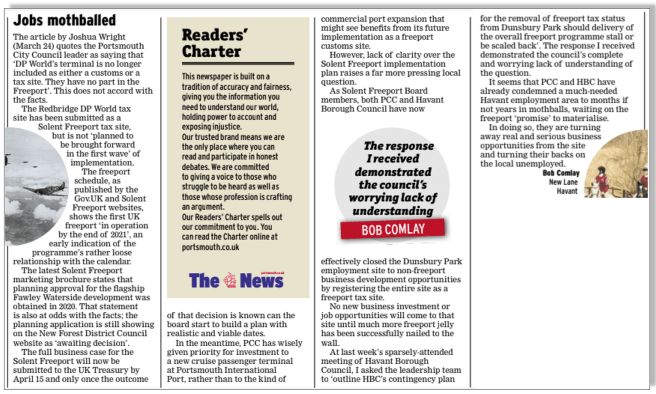 “If the Solent Freeport Programme implementation schedule is further delayed, or if the PCC/HBC component of the freeport doesn’t generate physical development and hence jobs within, let’s say, two years, what is the fallback plan for enabling Dunsbury Park to revert to ‘normal – non-freeport – use’?”