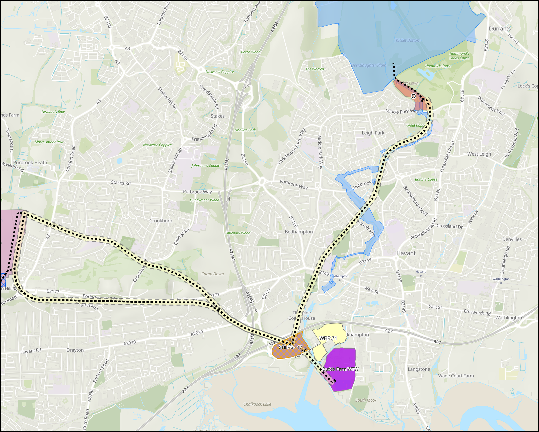 The map below shows the local area around Havant, showing the routing for the pipelines and the siting of the Water Recycling Plant at Bedhampton Wharf.