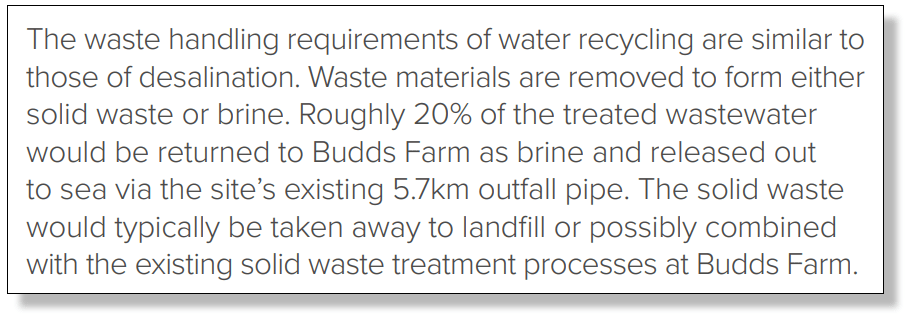 The second and third solutions, ‘desalination’ and ‘water recycling’, referred to state-of-the-art industrial plants new to the UK, either of which would use the same energy-intensive reverse osmosis filtration process to purify incoming water at the molecular level. Novel technology with a high carbon footprint which outputs 70% clean drinking water at the expense of 30% concentrated waste. The solid waste is sent to landfill while warm, concentrated liquid waste is discharged through outfalls into the Solent.