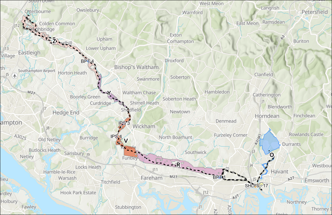 Southern Water appear to have parked the plan to bring in a waste water feed pipe from Peel Common as shown in the following image from the first round of the consultation, last year. We would expect that pipeline to reappear once the initial period of consultation has passed.