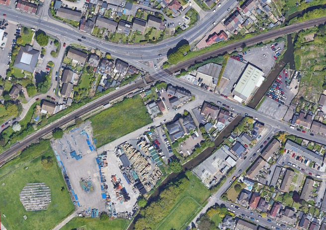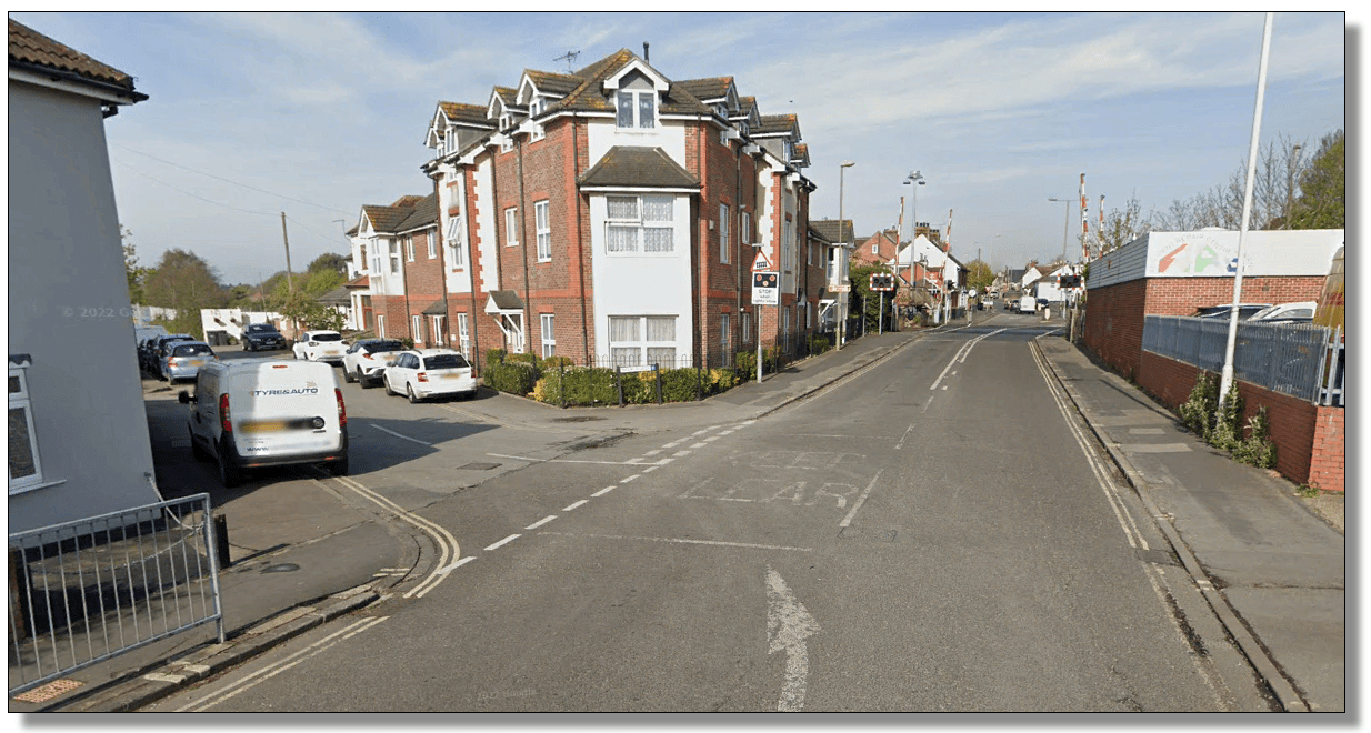 To set the scene, you can take a look at the site context in this composite image showing the area surrounding Bedhampton Station. In these images, Bedhampton Road curves up into New Road at the top, with the railway line and the crossing gates below and West Street heading off to the lower right. The second image overlays Bellway’s proposal for 90 housing units.