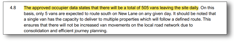 The reason everyone is getting a little twitchy is perfectly obvious to those who bothered to perform due diligence on the planning documents. Amazon, Kingsbridge Estates, TSL, HBC and HCC all know that the real traffic volumes that will be generated by the new ‘Delivery Station’ at 32 New Lane will be significantly higher than any of the numbers bandied around by its former Transport Consultant in their transport documentation. In fact, they’ve all been in possession of that information from the very start.