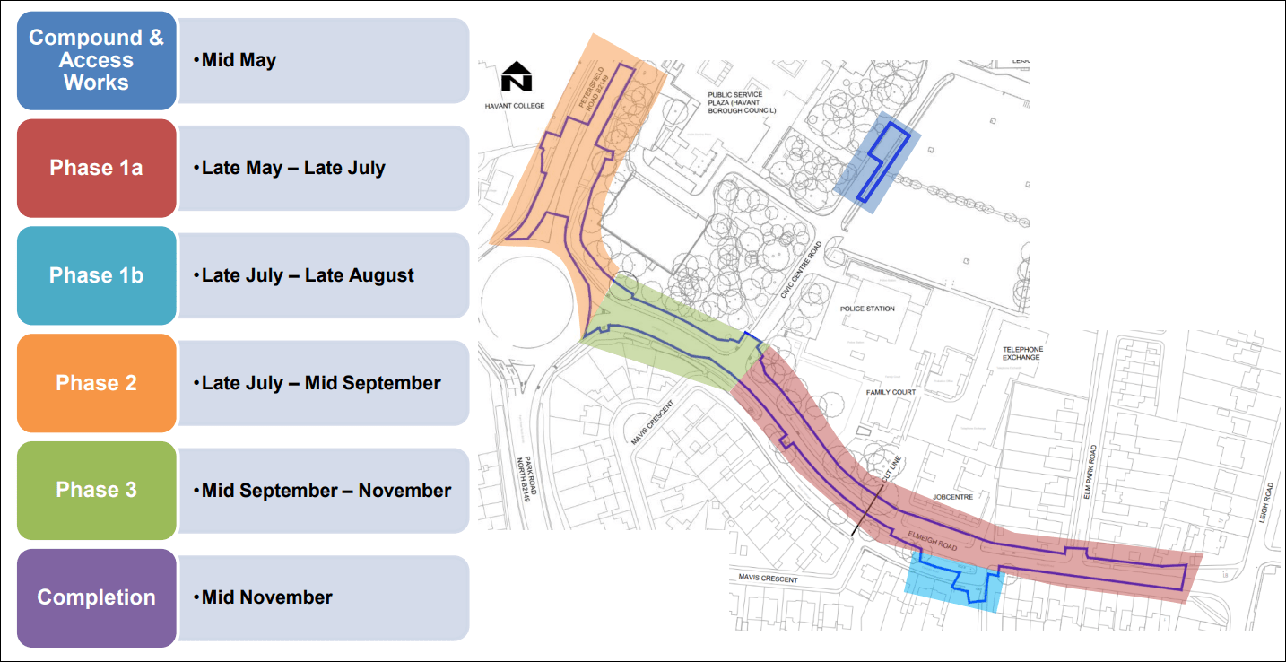 Unable to use the ringfenced ‘Transforming Cities Fund’ to fill in some of the increasingly dangerous potholes in the borough’s local roads, Hampshire County Council is about to embark on the next phase of its local cycling and walking infrastructure projects. The warning signs have been up for a couple of weeks now, threatening roadworks ‘from May 15 til December‘. Those of you assuming that the road surface on the Civic Plaza roundabout and its approach roads are about to be resurfaced may be disappointed.
