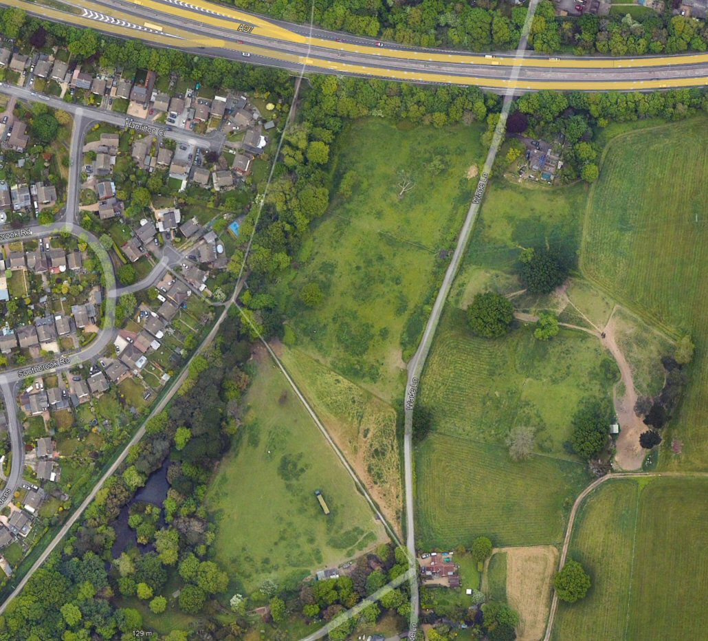 Perhaps the most difficult and contentious site on our patch. If the council really want to raise the voting turnout figures, this could be the ‘development opportunity’ to do just that. This is a rather better known horses’ field in the south of the borough. Half way down the mainland side of the Billy track, south of the A27 is a well known and well loved country walk down to the shore at Wade Lane. Swipe the image or click the arrow to see the scale of that development suggestion.