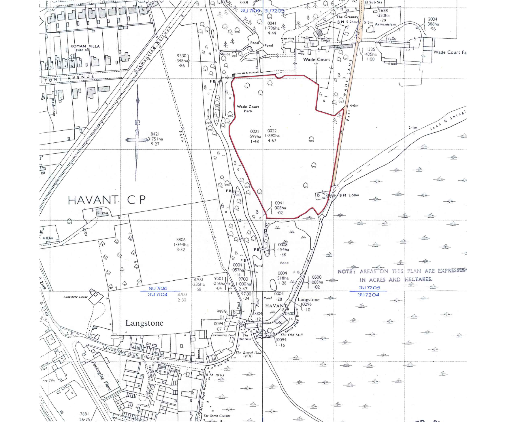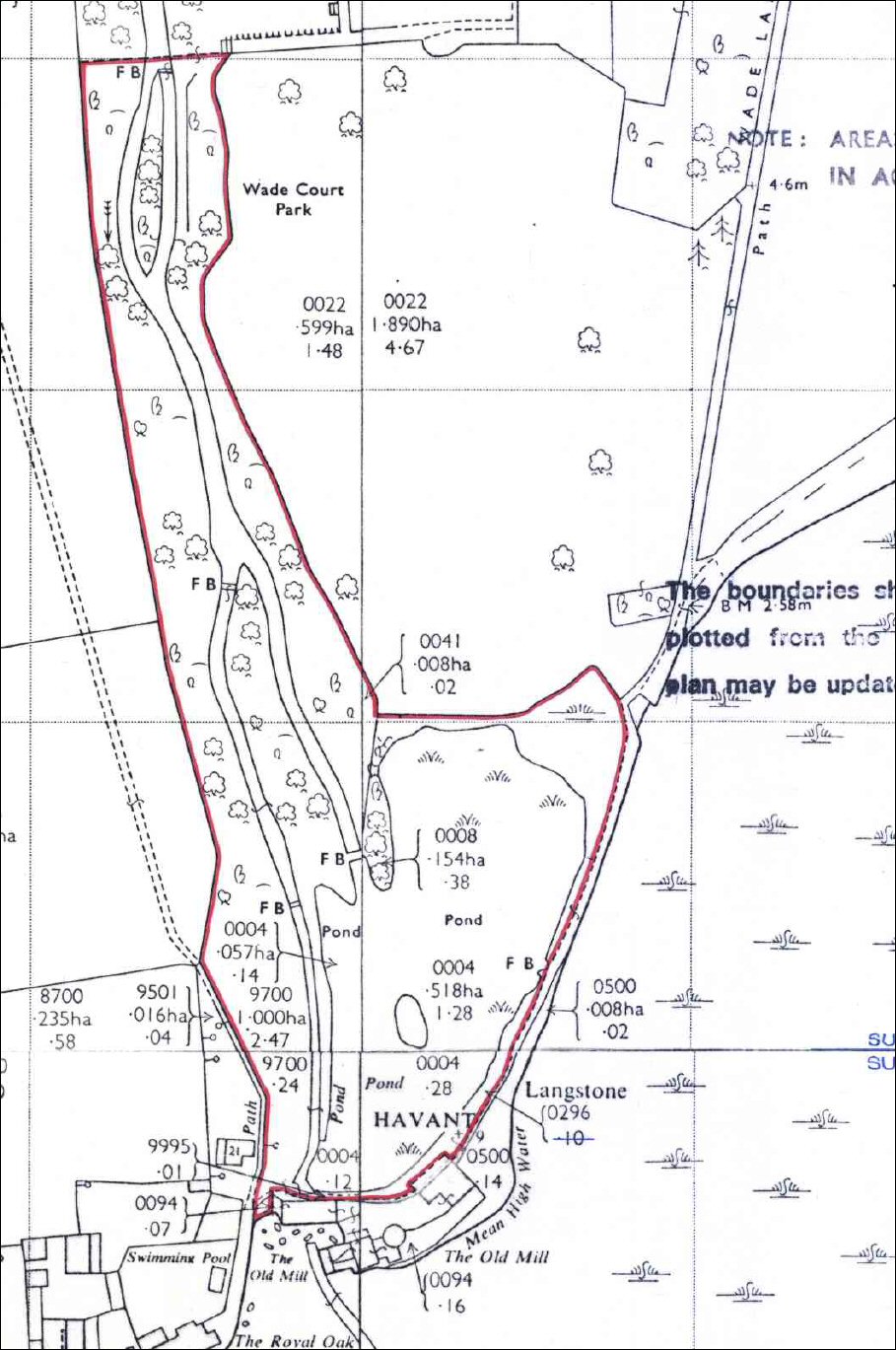 The Millpond, along with a stretch of the Lymbourne Stream, has a separate entry, ‘Land adjoining The Old Mill, Langstone’, registered with the same ownership as The Old Mill. The extent of the land holding is shown on the title plan outlined in red: