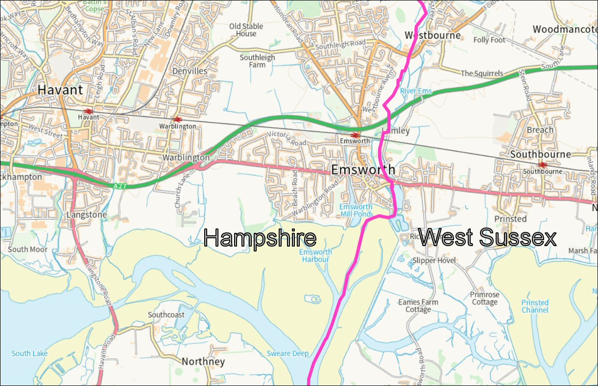 The county administrative boundary for the land and the shoreline between Langstone Harbour and Chichester Harbour, including the responsibilities for planning, is further to the east, with the River Ems marking the county boundary at the shoreline.