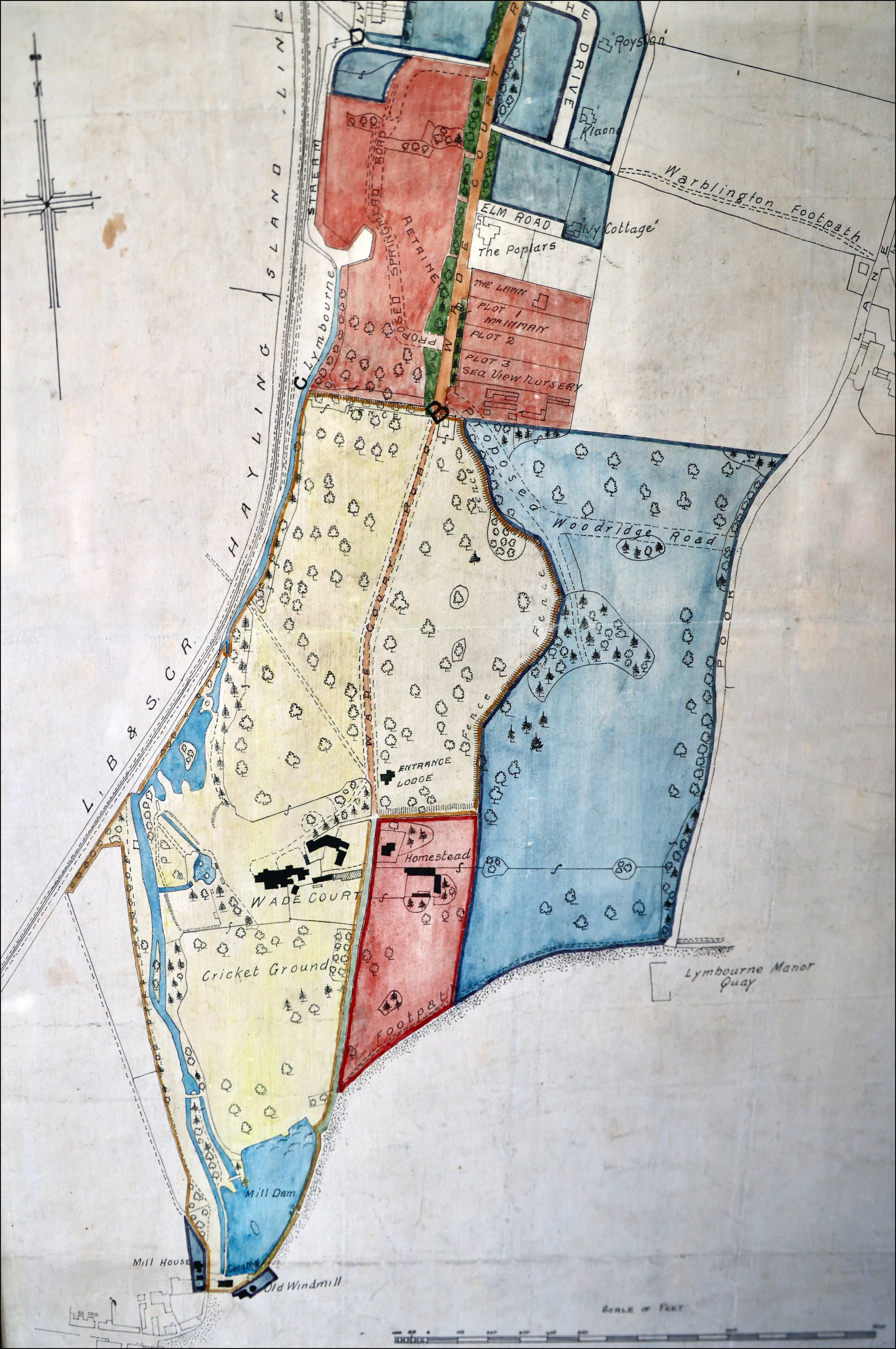 Our first point of reference here is the map included with the 1912 auction catalogue for the sale of land belonging to the Wade Court Estate. This lovely water-coloured map shows the parcels of land included in that sale, including the millpond and neighbouring properties. For a little more information on the Wade Court estate, please refer to this recent article on the estate published in the Winter 2020 / Spring 2021 issue of Hampshire Gardens Trust magazine.
