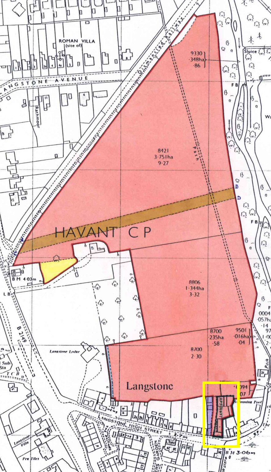 The actual building with that description, together with its outbuildings to the rear, may have been the ‘new’ farmstead for the Langstone Farm land, once the new railway had cut through the original Langstone Farm land. The ‘current’ Langstone Farm building was constructed to the east of the now sadly-destroyed ‘railway cottages’. A good long look at the detail in the Land Registry plan shows that the real ’15 Langstone High Street’, which has been in separate private ownership since 1997, has its own new title register entry under a new name. At that point, it seems that current registered owner of the entire red-shaded meadow became none other than Hampshire County Council.
