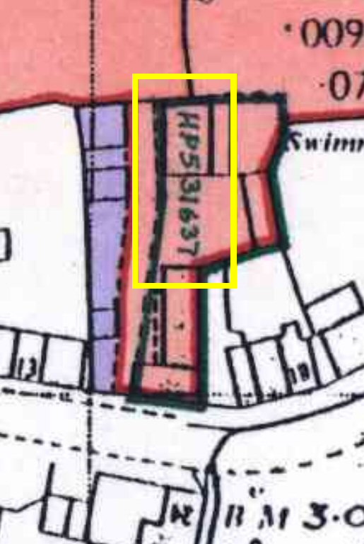 The second slide shows a large area tinted red which many locals will recognise as the meadow which runs between the Billy Track and the north side of Langstone Village including the well-trodden footpath which leads down to the mill buildings and The Royal Oak. Selecting a point right in the middle of the meadow, the documents identified in a Land Registry search shows the title of the register entry as ’15 Langstone High Street, Langstone’, which needs a little more explanation.