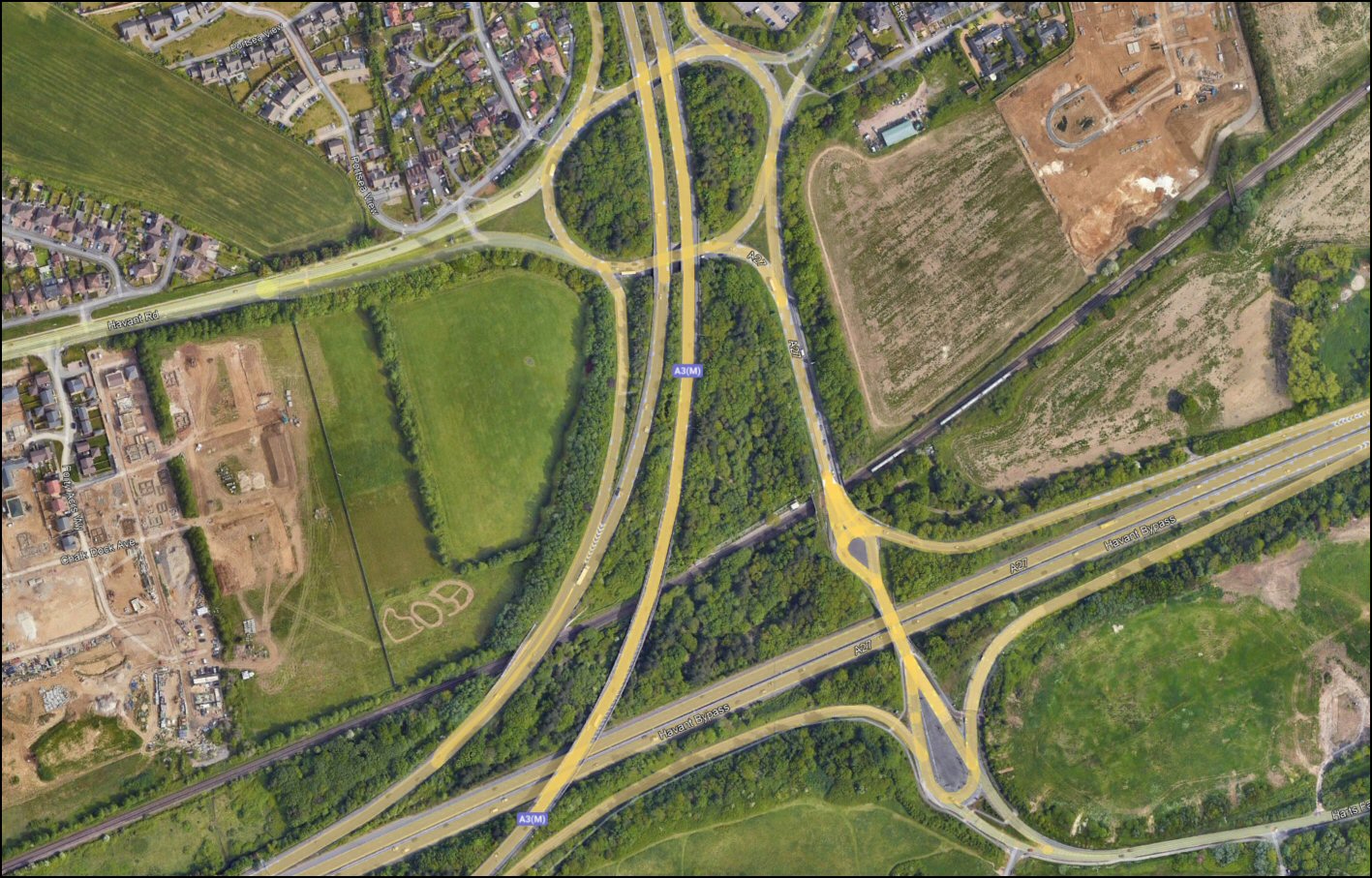 The junctions linking Havant Town with the A27 and A3(M) are sensitive points on the strategic road network, not helped by restricted access at two of the busiest, the Bedhampton A3(M)/A27 junction and the junction of Purbrook Way with the A3(M). The following slides offer two views of these junctions, the “eye of the designer” view followed by an aerial view of the actual junction in the context of its surroundings.