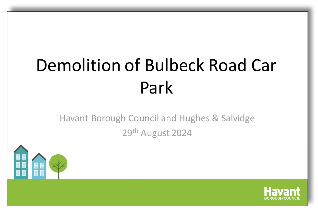The occasion was Havant Borough Council’s public meeting to introduce Hughes & Salvidge as the demolition team contracted to take down the Bulbeck Road car park, starting 9 September. To view the Council’s slideshow, please click the image below.