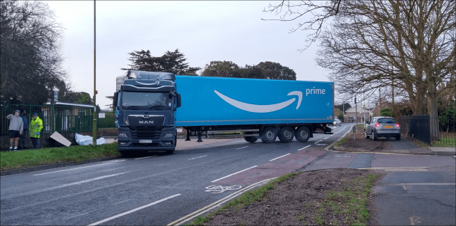 Six-axle articulated vehicles measuring 54 feet in length and weighing up to 44 tons have now become commonplace on UK roads and with Amazon now operating at 32 New Lane, the estate hosts a 24/7 business operation for the first time in its history.