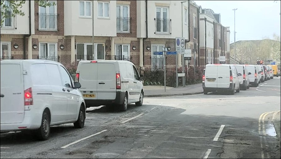 I stood on the corner of Town Hall road by the Spring art centre and counted 17 white vans coming out of town hall road, obviously they were eating for a train to go through.
