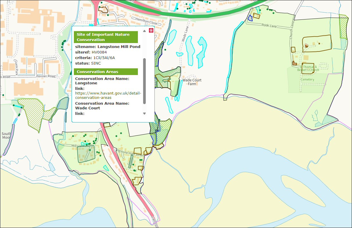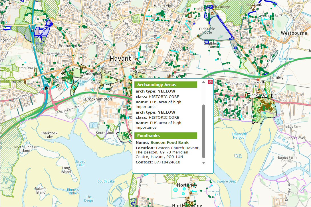 In this extension to the previous example, zoomed out to show the whole of Havant, we’ve highlighted the Meridian Centre. Homing in on the spot and clicking the map shows other Geographic Information System, GIS, data that the Council has in its database including, in this example, the local Archaeology Area and the details of a food bank (an odd combination!).