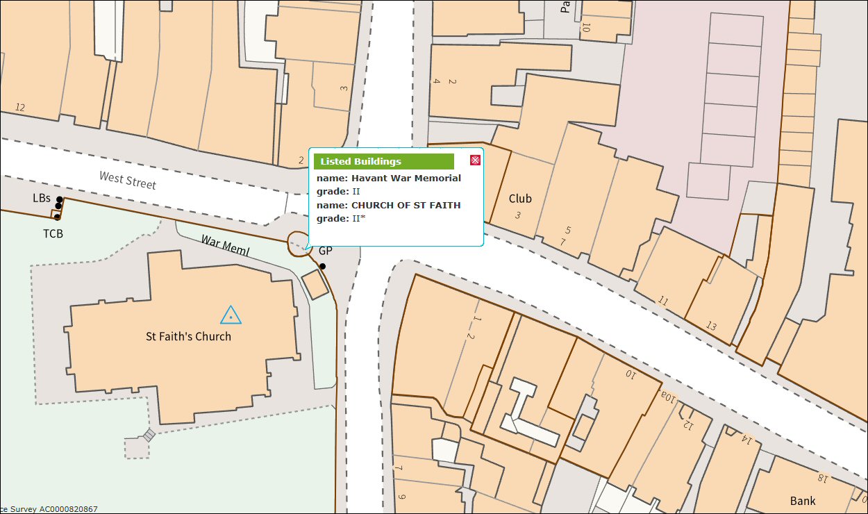 Showing the listed buildings – those surrounded by a red line – is straightforward. Click within the red line to see a summary of the listing.
