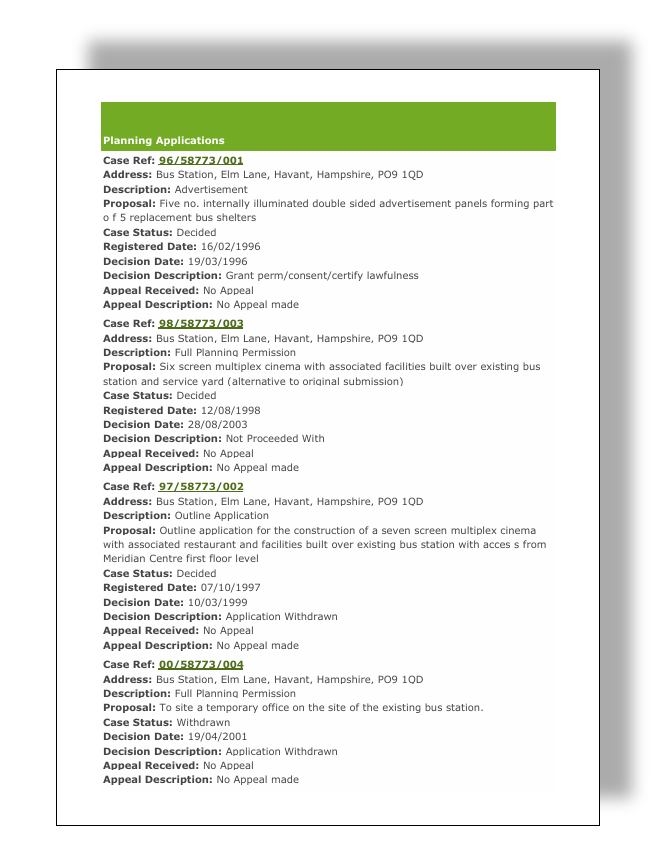 In the example shown below, we’ve selected the blue dot on top of the bus station, which brings up an information box showing the planning history for the site. Note that you can scroll through this display to view the history and select some entries.