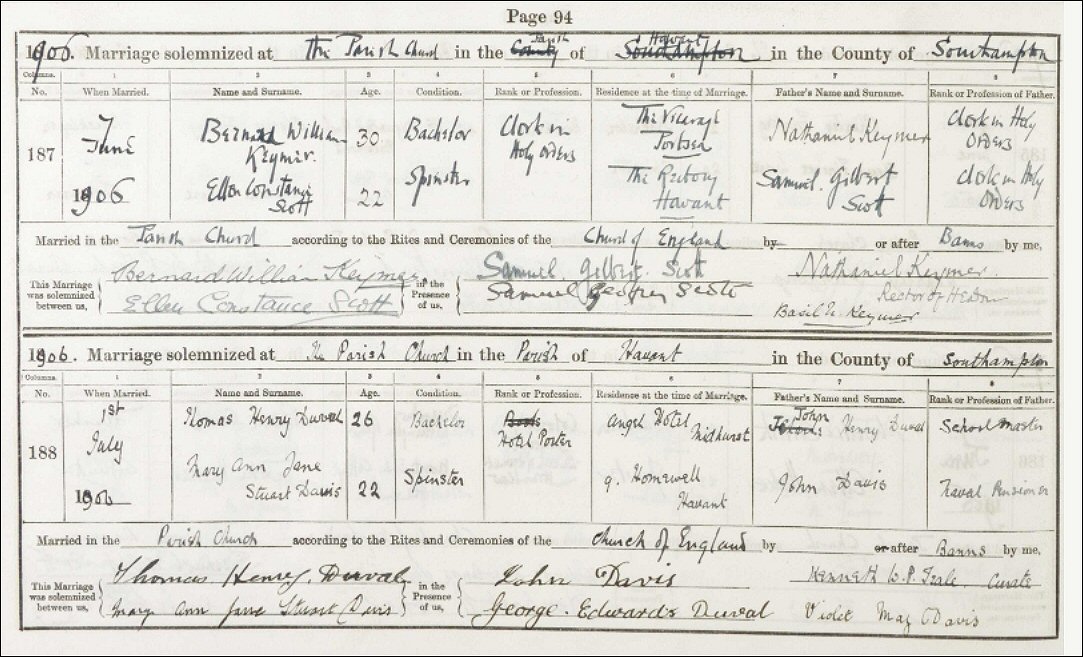 Considerable interest was manifested yesterday in the wedding of Miss Ellen Constance Scott, third daughter of the Rev. Canon S. G. Scott, Rector and Rural Dean of Havant and of Mrs. Scott; The Rectory, Havant, to the Rev. Bernard William Keymer, M.A., Senior Curate of St. Mary’s Church, Portsea, son of the Rev. Canon Keymer, Canon of Southwell, and Rector of Headon, Notts.