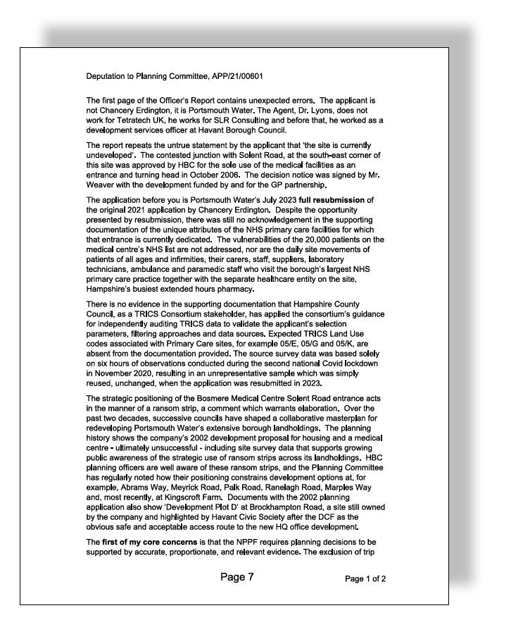 There are seven written statements in all, starting with the ever-annoying Mr Comlay, followed by the Senior Partner at the GP surgery, the PPG (Patient Participation Group) Chairman, the Pharmacy owner, Bob Taylor, CEO of Portsmouth Water and his planning consultant, a former HBC Planning Services officer, Dr Chris Lyons.