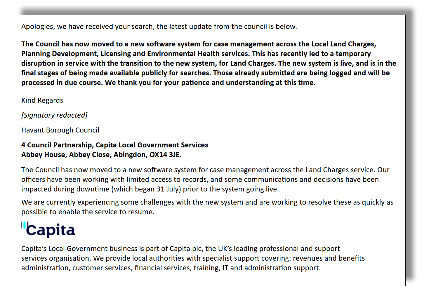We outlined the background to this issue in a previous post, dated 2 October. Since then, the continued silence from Havant Borough Council has been striking. Dozens of prospective house buyers and sellers, frustrated by delays in property searches across the borough, are receiving inadequate responses from the HBC Land Charges Team Leader – who, rather tellingly, appears to be a Capita employee working out of Abingdon, Oxfordshire.