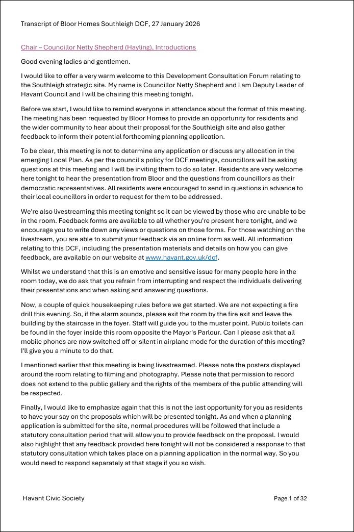 HCS report of the Southleigh Development Consultation Forum, 27 Jan 2026